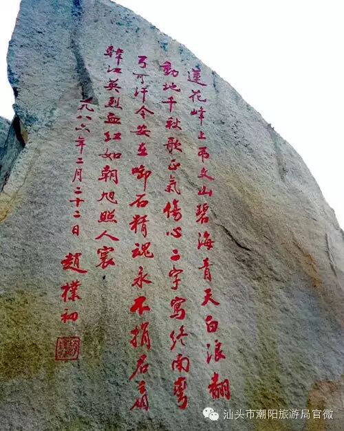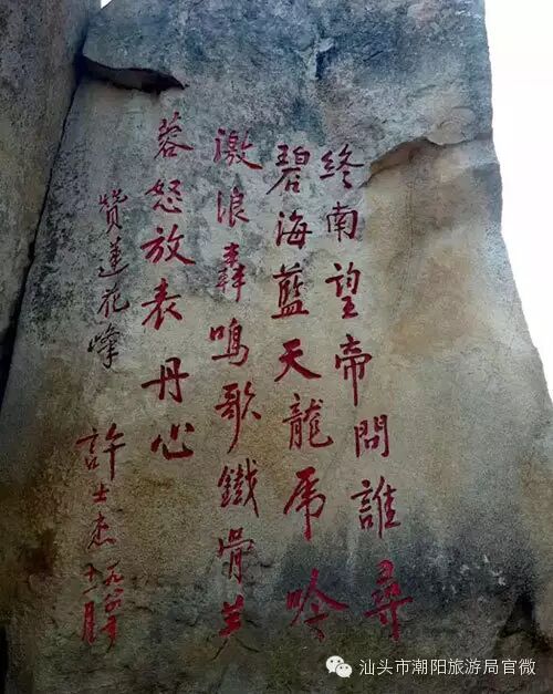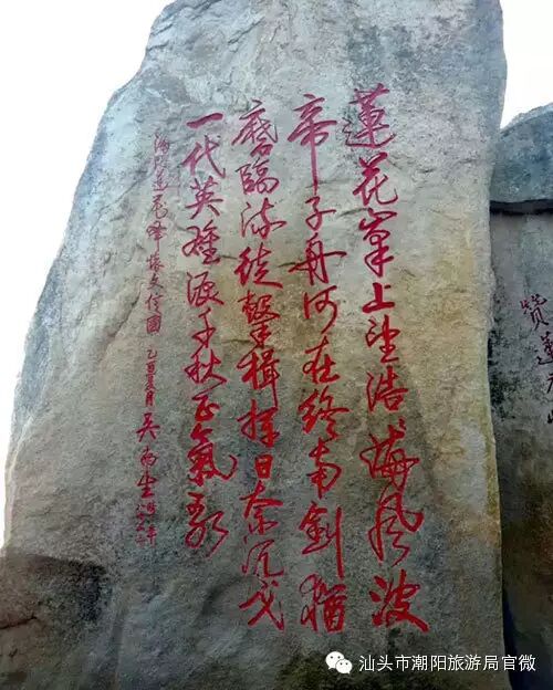 公元一二七八年,南宋民族英雄文天祥率领义军,追踪十岁小皇帝赵炳至潮阳莲花峰,在此登峰望帝,眺望茫茫大海,极目寻望帝舟踪影,帝舟片影无踪。山峰是由几片纵裂的花岗岩石拱围拼凑而成,从陆上远眺俨然若一朵含苞待放的莲花,从海上观之,则仿佛是一朵出水芙蓉,故文天祥将该峰命名为“莲花峰”并刻石。 自此以后,便有历朝历代的文人墨客慕名前来,留下了宝贵的丹青墨宝,还有近百幅的摩崖石刻,形成了莲花峰不朽的石头历史文化──莲花峰摩崖石刻群。更为可贵的是多位国家领导人慕名前来视察指导,留下珍贵的墨宝,莅临的国家领导人有:杨尚昆、乔石、宋平、姜春云、叶选平、胡绳、王汉斌、廖汉生、赛福鼎、王兆国、钱伟长、李贵鲜等。 莲花峰得天独厚的滨海风光也是旅游的好去处。莲花峰海岸线绵长,沙洁水清,夏日弄潮戏水,另有一番情趣,在季节时令适宜时,还可领略到景观壮丽的莲峰海色八景:碧海静波、浅滩怒涛、乘风扬帆、夕阳归舟、大屿塔,狮首航灯、春朝蒙雾、秋阳浴日等。 来源:爱上海门